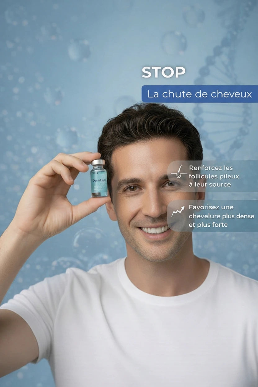 DermCapil s’adresse aux hommes confrontés aux premiers signes de chute de cheveux, à une perte de densité ou à un affinement capillaire, notamment liés au stress, à la fatigue ou au rythme de vie.